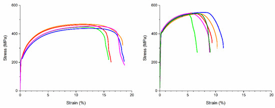 Stress–strain curves of tensile test of PBF-EB processed (left) and heat-treated (right) iron/10 wt.% 316L/0.25 wt.% C tested perpendicular to build direction.