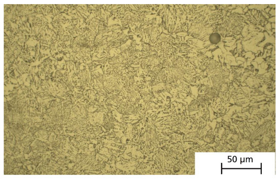 Metallographic analysis of the heat-treated specimen at low magnification showed some inhomogeneity again. Similar to Figure 5, they are coarser than individual layers. Figure 7 depicts the microstructure at higher magnification. It consists of ferrite grains and a fine network of precipitated carbides.