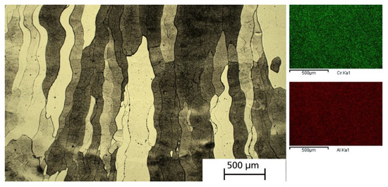For these experiments, equal parts by weight of WA iron powder and Fe-34.9Cr-15.9Al master alloy were blended. The theoretical chemical composition is Fe-17.5Cr-8Al. Blending increases the flowability and apparent density compared to pure WA iron. The measured Hall flow rate was 23.0 s, and the apparent density was 3.54 g/cm3. Due to the fine fraction of the master alloy, some dusting was observed. Because this blend showed less sintering activity compared to previously mentioned iron materials, the preheat temperature of the powder bed had to be increased to 950 °C to provide PBF-EB process stability. During the melt parameter development, it was noted that high beam power and high energy density led to pronounced swelling of the top surface. High densities were obtained for EV in the range of 40 J/mm3 to 70 J/mm3. The specimen displayed in Figure 8 was PBF-EB-fabricated with 5 mA beam current and 750 mm/s scan speed. Its microstructure is characterized by very large grains elongated in build direction. The chromium content measured by EDX was 18.2 wt.%, while the aluminum content was 7.5 wt.%. Other samples with higher volumetric energy density showed reduced content of alloying elements. A specimen with EV of 60 J/mm3 contained only 16.0 wt.% Cr and 6.5 wt.% Al. In all cases, the EDX element mappings showed a homogeneous distribution of Cr and Al on a scale of several 100 µm.
