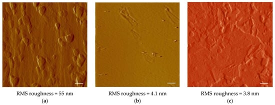 The electropolished surface appears more heterogeneous and consists of terraces and depressions with different sizes delimited by shallow steps (Figure 3c). Electropolishing converted the original annealed surface, substantially smooth with few protrusions, into a less uniform surface, characterized by a small vertical span in the roughness profile. The result is a minimal decrease of surface roughness, from 4.1 nm to 3.8 nm.