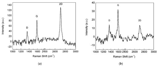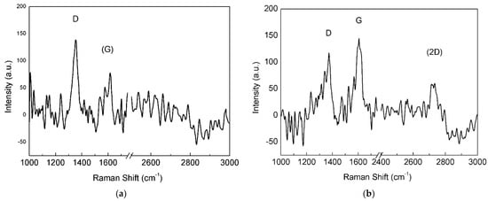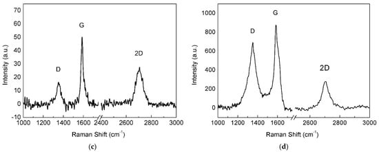 Raman spectra on untreated Cu foils showed a luminescence band [29], typical of Cu substrates irradiated with green light, that was removed in order to properly compare the Raman spectra (Figure 4a–d).