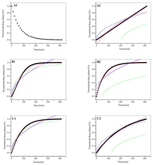 - Ritger, P.L.; Peppas, N.A. A simple equation for description of solute release I. Fickian and non-fickian release from non-swellable devices in the form of slabs, spheres, cylinders or discs. J. Control. Release 1987, 5, 23–36. [Google Scholar] [CrossRef]