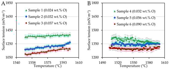 In addition to Figure 1, the oxygen content influenced the surface tension. As the oxygen content increased in minimal quantities, the surface tension of the steels investigated decreased significantly, which was also confirmed statistically by the Kruskal–Wallis test [], according to which the effect was statistically significant (p-value << 0.001). Oxygen is a surface-active element segregating on alloy surfaces. The driving force of this phenomenon is the difference in surface energy and heat of solution between alloy constituent components, whereby elements with lower surface energy and positive heat of solution tend to segregate to the surface []. Here, at concentrations on the order of hundreds of ppm, oxygen forms a monolayer and changes the arrangement of the steel components compared to the bulk, which in effect reduces the surface tension []. The change in surface tension also had its response in wetting angles.