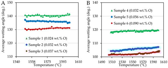 The wetting angles that characterize the degree of interaction between the steel and the substrate are provided in Figure 2. There was only a very slight dependence on the temperature in the case of both series. However, the oxygen content affected the values of the wetting angles, reducing them in both cases.