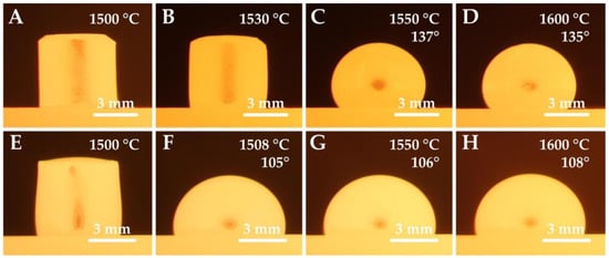 For simplicity, we will only consider samples 2 and 5, which can be viewed as representative in terms of interaction. In the case of the chromium series, the free surface was locally covered with a fine layer of chromium oxide (Figure 4A) due to the higher oxygen and chromium content (approximately 4.5 wt%), which prevented the droplet from shaping in the early stages of melting. For this reason, the measured properties (surface tension, wetting angles) are only given from a temperature of 1550 °C. On the other hand, for the nickel series, a thin discontinuous layer of iron oxides was detected on the free surface of the droplet, which did not influence drop shape forming nor optical determination of the liquidus temperature (Figure 4E). It should be noted that the nickel series contained twice the amount of oxygen as the chromium series. The thickness of the oxide layer formed on the droplet surfaces reached 1.2–2.2 µm, and can be seen in Figure 4B,F. This layer was formed due to a larger amount of oxygen of the order of 102 ppm. As confirmed by our previous studies, when using the same apparatus and conditions, no oxide layer was present on the surface when the oxygen content was around 10 ppm [].