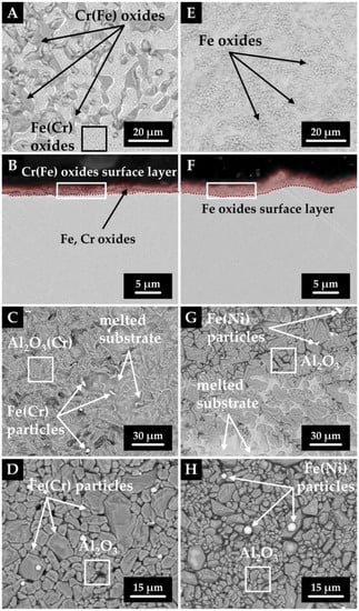 SEM images of the corundum substrate are shown in Figure 4C,D,G,H. In the case of specimen 2, the surface of the corundum substrate was partially melted in the wetted area, and iron and chromium particles were detected locally. In contrast, a nearly intact corundum structure and scattered iron particles were found in the outer region. Analysis of the corundum substrate of sample 5 gave similar results, that is, the area below the drop was locally melted and contained iron particles bearing trace amounts of nickel. The surrounding area remained unchanged except that iron particles were found on its surface. In addition, the average particle size was on the order of micrometers (2–5 µm).