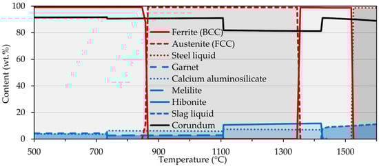First, a simulation of the interactions that take place at the phase interface of sample 2 was performed (Figure 5). Up to a temperature of approximately 1520 °C, the FCC and BCC steel matrices were the dominant phases. They were then swiftly suppressed in favor of the liquid phase reaching a maximum at a temperature of 1529 °C. Also, the formation of various oxides, carbides, and sulfides occurred in a broad temperature range but to a much lesser extent. As regards the corundum substrate, the evolution of phases was more diversiform. The most abundant was corundum, whose declines were accompanied by the formation of other phases, i.e., calcium aluminosilicate and hibonite, beginning at temperatures of <500 °C and 1110 °C, respectively. In addition, other phases such as garnet and melilite also occurred, with the onset temperature of the former phase and the extinction temperature of the latter phase being the same, i.e., 735 °C. Of particular interest is the partial melting of the substrate surface at temperatures above 1425 °C which was suggestive of the proposed mechanism. The interaction of sample 4 was also simulated, with the same phases forming, but with the difference that their formation temperatures were slightly shifted, namely the substrate melting occurred at 1405 °C.