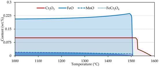 Second, we took a closer look at the free surface of the steels and the formation of oxides. The simulation was carried out in the temperature range 1000–1600 °C (Figure 6). In the case of chromium steel, only chromium oxide was formed, which was stable up to a temperature of 1585 °C. When the chromium content was reduced by three orders of magnitude, iron oxide and chromite (FeCr2O4) were produced. Reducing the oxygen content while maintaining the original chromium level resulted only in shortening the Cr2O3 occurrence interval. On the contrary, for nickel steel, iron oxide, manganese oxide, and chromite were present up to about 1500 °C.