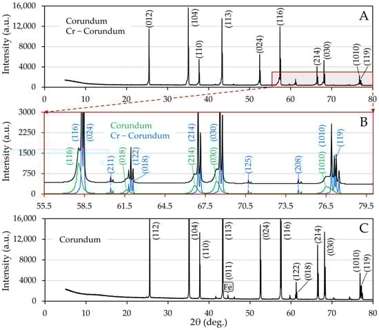 According to lattice parameters, the more pronounced phase can be interpreted as unsubstituted corundum, whereas the second one is Cr-doped corundum. Variation in half-widths indicates significant crystallite size differences, 907(30) nm for unsubstituted and 36.62(77) nm for substituted corundum. Assuming that the change in unit parameters depends linearly on the chromium oxide content, the measured lattice parameters a0 and c0, which were a0 = 4.77709(38) Å, c0 = 13.0598(13) Å fall within the interval corresponding to a 10% substitution by weight [,], where the uncertainties in parentheses were evaluated by the Rietveld optimization. It should be noted that Cr(III) ions can enter the corundum structure and substitute for Al(III) since they are only a bit larger. Chromium ions have two strong absorption bands in the visible spectrum, which give the substituted corundum a reddish color [].