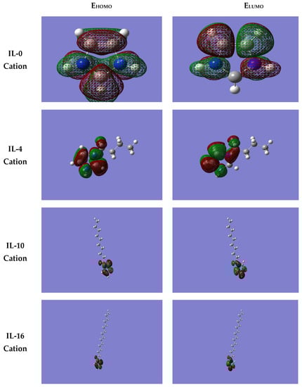 | IL’s Cation | EHOMO, (eV) | ELUMO, (eV) | Energy Gap ΔE, (eV) | Dipole Moment µ, (Debye) | Electron Affinity A, (eV) | Ionization Energy I, (eV) | Electronegativity, (eV mol−1) | Hardness ɳ, (eV mol−1) | Softness σ, (eV−1) |
