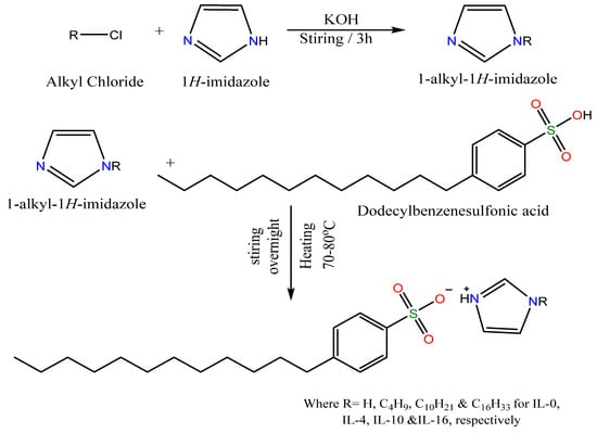 - Four new ionic liquids were synthesized via the reaction of alkyl imidazoles with dodecylbenzene sulfonic acid. They were characterized well by FT-IR, 1H-NMR, and Elemental Analysis.
