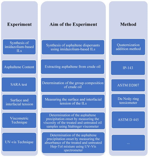 - Boukherissa, M.; Mutelet, F.; Modarressi, A.; Dicko, A.; Dafri, D.; Rogalski, M. Ionic liquids as dispersants of petroleum asphaltenes. Energy Fuels 2009, 23, 2557–2564. [Google Scholar] [CrossRef]