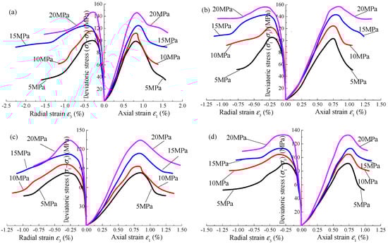 Stress–strain curves of Na2SO4 corroded sandstone under triaxial loading: (a) α = 0.02 mol·L−1, pH = 2; (b) α = 0.02 mol·L−1, pH = 12; (c) α = 0.04 mol·L−1, pH = 2; (d) 0.10 mol·L−1, pH = 2.
