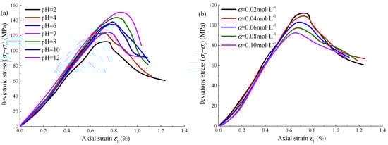 Axial stress–strain curve of Na2SO4 corroded sandstone: (a) α = 0.02 mol·L−1; (b) pH = 2.