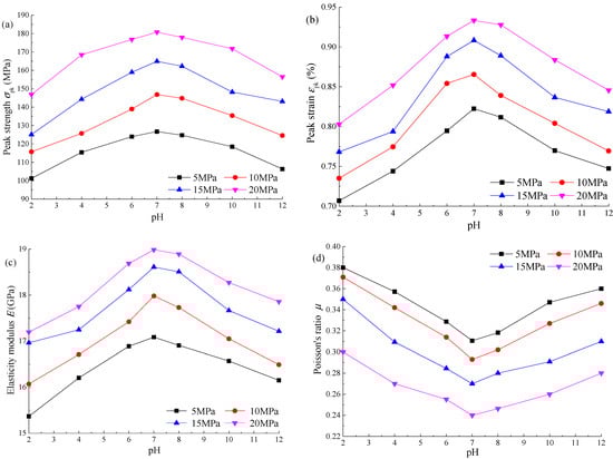 Distribution curve of mechanical parameters with pH of Na2SO4: (a) peak strength σpk; (b) peak strain εpk; (c) elasticity modulus E; (d) Poisson’s ratio µ.