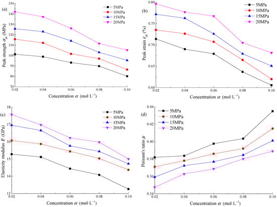 Distribution curve of mechanical parameters with concentration α of Na2SO4: (a) peak strength σpk; (b) peak strain εpk; (c) elasticity modulus E; (d) Poisson’s ratio µ.
