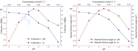 Figure 6 shows the distribution curve of cohesion c and internal friction angle φ with pH and concentration α of Na2SO4 solution. At the same concentration, with the gradual increase of pH, the cohesion and internal friction angle increase first and then decrease, and the maximum value is taken at pH = 7. The relationship between shear strength parameters and pH approximately satisfies the quadratic function. At the same pH, with the gradual increase of concentration, the cohesion and internal friction angle of sandstone show a gradually decreasing trend, and the greater the concentration, the greater the slope of the curve. According to Figure 6, when pH = 7, the cohesion and internal friction angle are 17.26 MPa and 42.23° respectively. When pH = 2, the cohesion is 14.41 MPa, the internal friction angle is 39.02°, the pH is reduced from 7 to 2, and the two parameters are reduced by 16.51% and 7.60% respectively. When pH = 12, the cohesion is 14.95 MPa, the internal friction angle is 39.95°, the pH increases from 7 to 12, and the decreases of two parameters are 13.38% and 5.39% respectively. When sandstone is in a strong acid environment, the corrosion degree is the most serious, followed by a strong alkaline environment. When sandstone is in weak acid or weak alkaline environment, the corrosion degree is alleviated, and when sandstone is in a neutral environment, the corrosion degree is the least.