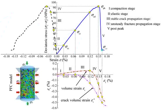 Curves of stress–strain, volume–strain, and crack volume–strain in the whole process of rock triaxial compression.