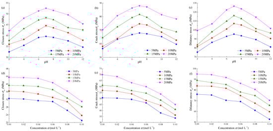 According to the triaxial loading test results of Na2SO4 corroded sandstone, the distribution curve of characteristic stress with pH and concentration α of Na2SO4 solution under different confining pressures are shown in Figure 8. By observing the change law of Figure 8a–c, it is found that the closing stress σcc, initiation stress σci, and dilatancy stress σcd approximately meet the quadratic function relationship with pH, and the corrosive effect of acidic environment on sandstone is stronger than that of an alkaline environment. By observing the change of Figure 8d–f, it is found that the closing stress σcc, initiation stress σci, and dilatancy stress σcd of sandstone approximately meet the exponential function relationship with the concentration α, and the greater the concentration, the greater the slope of the curve, and the stronger the corrosion effect on sandstone.