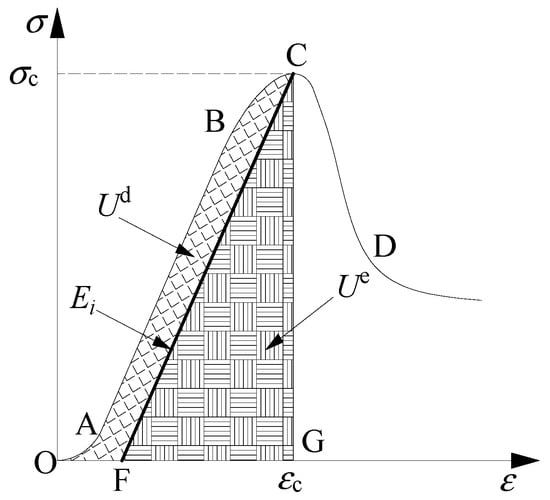 Assuming that the heat energy generated by the temperature change of the external system is not considered, the work done by the external force on the rock can be roughly divided into two parts, one part is stored in the form of elastic strain energy, and the other part is dissipated in the form of damage energy. Considering the deformation of a single specimen under external force, assuming that there is no heat exchange with the outside, the system is considered to be a closed system []. The energy satisfies the following equation: