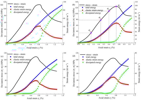 - When the axial stress exceeds the dilatancy stress σcd, the specimen enters the unstable crack propagation stage. The damage degree and plastic deformation increase greatly, the dissipated energy begins to accelerate, the curve slope gradually increases, and the slope of the elastic strain energy curve begins to decrease, but the elastic strain energy is still the main stage. When the axial stress reaches the peak strength σpk, the elastic strain energy releases rapidly, the dissipated energy increases rapidly.