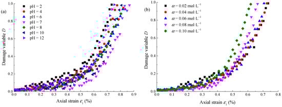 According to Equation (11) and the characteristics of the dissipated energy evolution curve, when the dissipated energy Ud exceeds the dissipated energy Udpeak corresponding to the peak strength at any time, the damage variable D > 1, and the damage variable loses its significance. Therefore, this paper only analyzes the damage of sandstone before peak strength. Taking the confining pressure of 10 MPa as an example, the distribution curve of damage variables under different pHs and concentrations α is shown in Figure 11. With the increase of axial strain, the damage variable increases under different test conditions. According to Figure 11a, when pH = 7, the damage variable corresponding to the same strain is the smallest. According to Figure 11b, when α = 0.02 mol·L−1, the damage variable corresponding to the same strain is the smallest. It shows that a neutral environment and low concentration have little damage to sandstone before failure.