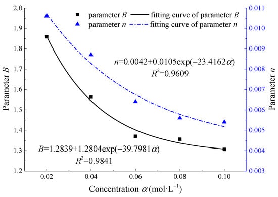 The parameters B and n decreased gradually with the concentration α. By fitting the curve with Origin, it is found that the relationship between parameters B, n, and concentration α meets the negative exponential function, which can be expressed by the following equation: