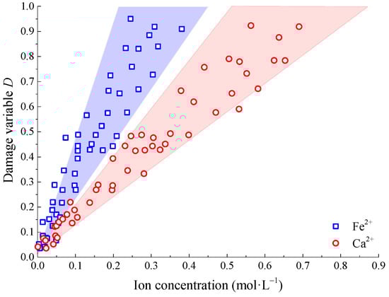- The Na2SO4 solution reacts with quartz (SiO2) on the surface of sandstone to form water-insoluble mirabilite (Na2SiO3). At the same time, Ca2+ in calcite and Fe2+ in hematite are dissolved and precipitated. With the increasing concentration of Ca2+ and Fe2+ in the solution, the damage variable increases gradually. The relationship between the two ion concentrations and the damage variable approximately satisfies a linear function.
