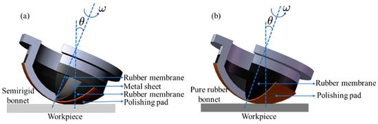 The SR bonnet and PR bonnet with radii of 40 mm were used in the experiment, as shown in Figure 2. The structure of SR bonnet is shown in Figure 2a [41]. It is composed of three layers. The outermost and innermost layers are rubber membranes, and the middle layer is a stainless-steel metal sheet with a thickness of 0.3 mm, which helps increase the tool rigidity and flexibility. The outermost rubber film is covered with a polishing pad. The flexible layer of the PR bonnet shown in Figure 2b is made of rubber with a shore hardness of 80.