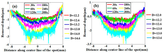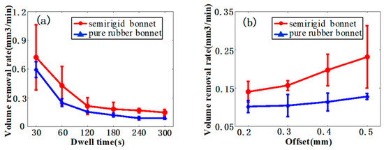 (a) Volume removal rate of TIFs under different dwell time, and (b) volume removal rate of TIFs under different offset.