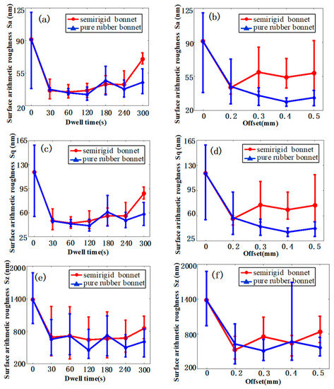 Figure 8a,c,e demonstrate the relationship between the roughness (in Sa, Sq, and Sz) and dwell time in the center of the TIF spot. The results show that both tools can greatly reduce the surface roughness in a short time. After polishing for 30 s, Sa can be reduced from 91 nm to ~36 nm. With the increase in time, the surface roughness converges to a value and the further increment is tiny. As shown in Figure 8b,d,f, the SR bonnet achieves the lowest surface roughness at the tool offset of 0.2 mm, while it is 0.4 mm for the PR bonnet. This is because a larger tool offset means a higher contact pressure, and the contact pressure of the SR bonnet is much larger than the PR bonnet. Furthermore, we found that under the same dwell time, the surface roughness achieved by the PR bonnet is slightly less than that obtained with the SR bonnet, which indicates that the SR bonnet can be used for the pre-polishing of titanium alloy, after which the PR bonnet can be introduced for a finer finish.
