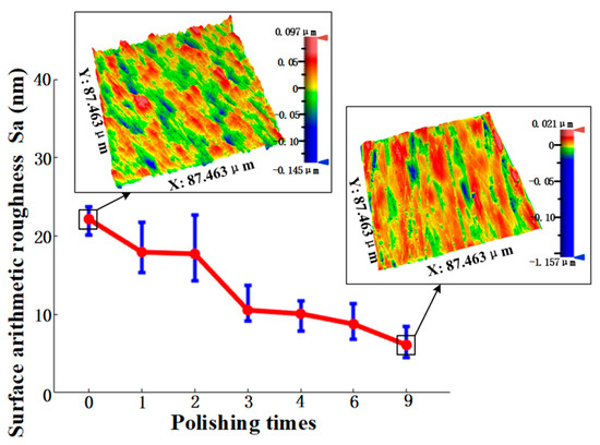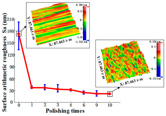 According to the above results, the use of the SR bonnet to polish the above titanium alloy samples reached the convergence value of surface roughness. Hence, finer polishing was subsequently conducted using the PR bonnet. Figure 10 shows the measured surface roughness after each polishing cycle using the PR bonnet. It can be seen that the surface roughness of the Ti6Al4V titanium alloy was further reduced to 17 nm Sa after 2 cycles of polishing. Polishing slurry with a smaller abrasive size of 0.5 μm was used for the next two cycles of polishing, and the surface roughness of 10 nm Sa was then obtained. Finally, a polishing liquid with an average particle size of 0.05 μm was used for further improvement of the surface. After five cycles of polishing, the surface roughness of the Ti6Al4V alloy converged to 6.1 nm Sa. Figure 11 shows the comparison of the surface of titanium alloy before and after polishing with the SR bonnet and PR bonnet, respectively; a highly smooth, mirror-like surface was successfully produced.