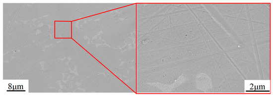 The surface micro-topography of the Ti6Al4V surface before polishing is shown in Figure 12. It can be seen that, due to the extrusion of the abrasive grains of the grinding wheel, plastic grooves and a large number of scratches formed on the surface of the titanium alloy. In addition, the adherent material can be clearly observed.