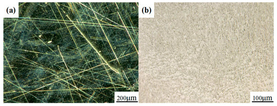 Figure 1 shows the metallographic structure observed by a metallographic microscope. As the titanium alloy formed by saw blade cutting had many scratches on its surface and the flatness was poor, it could not be directly polished. To ensure the unity of the experiment, a titanium alloy sheet with length × width × thickness = 100 mm × 100 mm × 10 mm was used as the sample for the mechanical characteristics experiment. The surface of the sample was ground by a 150-mesh grinding wheel to 3~4 λ (λ = 632.8 nm) peak-to-valley (PV), together with a surface average arithmetic roughness (Sa) of 0.2~0.3 μm.