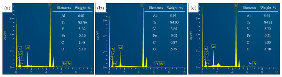 EDX results of typical areas of Ti6Al4V alloy surface before and after polishing: (a) EDX results before polishing; (b) EDX results of surface after polishing using SR bonnet; (c) EDX results of surface after polishing using PR bonnet.