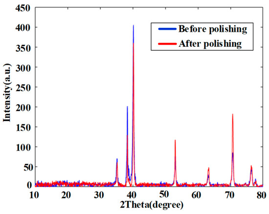 To investigate whether chemical reactions or material changes took place before and after polishing, EDX and XRD analysis were carried out. The EDX analysis results are shown in Figure 16, demonstrating that the surface chemical composition of the Ti6Al4V was basically unchanged. This reveals that the adhesion of titanium alloy during polishing is not due to a chemical reaction. At the same time, the phase detection of the titanium alloy before and after final polishing was carried out by XRD. As shown in Figure 17, the XRD curves are quite similar before and after polishing. Hence, no phase change occurred after polishing. Even though there are some variations at certain peaks, these may be due to the differences in surface roughness.