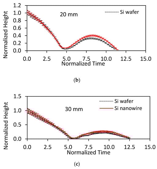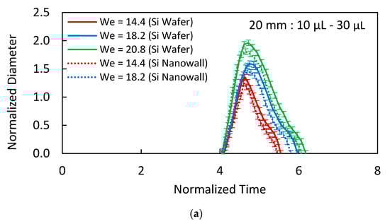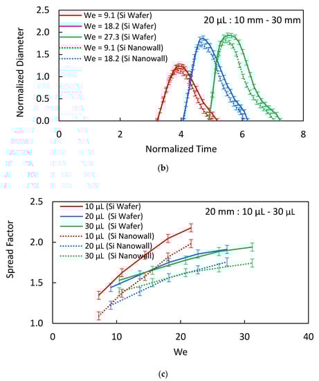 where is the work of viscous dissipation, Dmax is the maximum spreading diameter of the droplet, Re is the Reynolds number of impacting droplets, is the velocity of the spreading droplet, and is the solid fraction of the impacted surface [41]. Moreover, the elastic response of the impacted surface contributes to energy dissipation during the droplet impact. This becomes particularly important for soft surfaces, such as PDMS [42,43]. The rebounding height of the droplet reduces notably by viscoelastic energy dissipation [38,39]. The Young’s modulus of PDMS ranges between 0.57 to 3.7 MPa [43,44], while it is 130 to 188 GPa for silicon [45]. The energy dissipation due to the viscoelastic effect of the impacted surface is considered to be smaller than the energy dissipation, due to viscous dissipation and the work performed under volume deformation during impact. Hence, it is neglected in the analysis. The hydrophobized as-received silicon-wafer surface can be considered to be smooth, and the solid fraction, , becomes zero. Therefore, the slip velocity generated on the smooth hydrophobic silicon surface lowers the work of viscous dissipation. However, for the textured silicon-wafer surface, the slip velocity varies because of the presence of nanoporous textures (due to nanowalls). This alters the work of viscous dissipation. Hence, the ratio of work of dissipation, due to hydrophobized etched over the hydrophobized as-received surfaces, becomes . Moreover, the solid fraction can be expressed as for nanopores’ surfaces [36]: here, is the width of the nanowall and is spacing in between two consecutive nanowalls. For nanowalls’ pores sties, it yields almost 0.3. Hence, the work of viscous dissipation becomes almost 30% more for the hydrophobized textured surface than a hydrophobized smooth surface. This contributes to the maximum spreading diameter of the droplet; that is, the maximum spreading diameter is smaller for hydrophobized textured silicon surface. As the droplet impact height increases, so does the maximum spreading diameter. This can be seen from Figure 6b, in which the normalized spreading diameter with normalized time is shown for various impact heights for 20 μL of the droplet. An increase in the spreading diameter is mainly because of the inertial influence of the impacting droplet on the spreading rates, i.e., low value of Ohnesorge number (~1.9 × 10−3). The increase of the droplet diameter with time is in the form 4 up to the dimensionless time () of 4.5. As the time progresses further toward that corresponding to the maximum droplet spreading diameter, the droplet diameter increase becomes in the form of 2. Hence, the droplet speeding is rapid in the initial period, and it becomes gradual toward the end of the spreading period. Moreover, the spreading factor (, where D is the instant droplet diameter on the impacted surface and Do is the droplet diameter before impact) of the droplet is also shown in Figure 6c to demonstrate the influence of Weber number () on the droplet spreading for three droplet volumes.