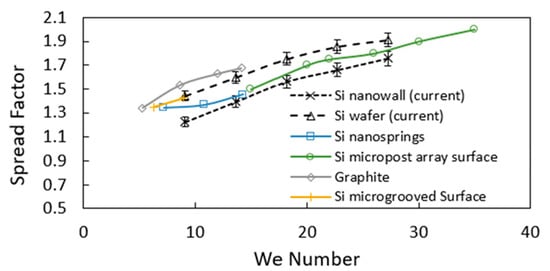The spreading factor remains smaller for the hydrophobized textured surface (due to pinning and shear effects) than for the hydrophobized as-received smooth surface. Moreover, further assessment of the variation of spreading rate with the Weber number is made for various hydrophobized surfaces. Figure 7 depicts the comparison of the spreading factor with Weber number for various hydrophobic textures, including silicon nano-spring [46], silicon micro-post arrays [47], graphite [48], and silicon micro-grooved surfaces [13]. Hydrophobized nanowall surfaces result in the lowest spreading factor as compared to other surfaces considered. This behavior is related to the pinning influence of the closed-cell nanowalls structures on the surface that suppresses the droplet spreading on the surface during the impact. Moreover, the spreading factor increases with the Weber number. This indicates that the droplet inertial force contributes considerably to the droplet spreading. Increasing droplet volume enhances the inertial force and the Weber number. However, it also increases the droplet spreading diameter over the impacted surface. This causes increased pinning and the viscous forces acting on the spreading droplet while lowering the spreading factor (Figure 6c and Figure 7). The transition duration of the droplet on the impacted surface is shorter for the hydrophobized textured surface than that of the hydrophobized as-received smooth surface. This is true for all sizes and impact heights of the droplets (Figure 6b). The short duration of the droplet’s residence time on the impacting surface reveals that the work of deformation of the droplet because of shape change (volume deformation) becomes small (Appendix A). Hence, because of the work of volume deformation, the energy dissipated becomes small for the hydrophobic textured surface. In the case of the retraction period, the time taken for the droplet retracting to the initial wetting diameter is much larger than that of the spreading period. This is mainly because of the energy losses associated with impacting droplets (Appendix A), i.e., : here, is work performed during volumetric deformation of the droplet (droplet shape change), viscous energy dissipation, and is the work performed against pinning. The droplet transitional velocity in the retraction period becomes smaller than the spreading period. Hence, the time taken for the rebounding of the droplet becomes long as the droplet-impact height increases (Figure 6b), which is also true for the case as the droplet volume increases. However, the difference between the retraction period of the droplet on hydrophobized textured and hydrophobized as-received smooth surfaces become small as the droplet volume increases while keeping the droplet impact height the same. This indicates that the droplet inertia has a critical influence on the retraction period compared to pinning and viscous dissipation alone.