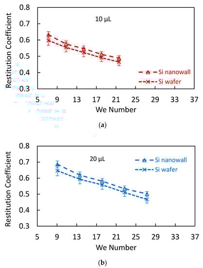 Once the retraction period of the droplet ends, the droplet undergoes rebounding from the impacted hydrophobic surface. Figure 8 shows the restitution coefficient of the droplet with Weber number for the cases of hydrophobized textured and hydrophobized as-received smooth surfaces. The influence of three droplet volumes on the restitution coefficient is incorporated in Figure 8. The restitution coefficient is the measure of kinetic energy after and before the impacting droplet (). The restitution coefficient remains high for the low values of the Weber number. This indicates that energy dissipated during the spreading and retraction periods becomes small as the Weber number reduces. It is worth mentioning that the Weber number is proportional to the droplet diameter and square of the droplet velocity. The hydrophobized textured (etched) surface results in larger values of the restitution coefficient as compared to that of the hydrophobized as-received smooth surface. This is related to the total energy dissipated during the droplet residency on the impacted surface. In addition, the air trapped within the nanowall structures is compressed by the impacting droplet fluid, and it acts as a compressed air cushion at the interface of the droplet fluid and the top surface of the nanowalls. This, in turn, contributes to the ease of droplet retraction on the impacted surface while reducing the pinning forces at the interface. Hence, the energy stored during compression of the trapped air contributes to the attainment of low energy dissipation in the droplet retraction cycle (Appendix A); that is, compressed trapped air creates a springboard effect on the rebounding droplet. It is worth mentioning that the penetration of droplet fluid in the nanowall cells results in the maximum droplet meniscus height (δ) of about 40 nm (Appendix A), which causes a pressure rise in the trapped air inside the nanowall cells. The droplet meniscus height enlarges with droplet size, which further increases the trapped air pressure in the cells. This gives rise to an increased restitution coefficient with increasing droplet volume. In addition, as the volume increases, the droplet spreading diameter on the impacted surface increases (Figure 6a), which enhances the coverage area of the trapped area at the interface. This improves the cushion effect of the compressed air at the interface while reducing energy dissipation during the droplet retraction period. However, as the Weber increases further beyond 30, the restitution coefficient reduces significantly, due to the droplet breakup into two secondary droplets; hence, only partial rebound is realized.