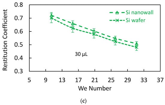 Restitution coefficient with Weber number for f: (a) 10 µL, (b) 20 µL, and (c) 30 µL droplets impacting on hydrophobized as-received silicon and hydrophobized etched silicon wafers.
