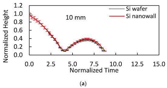 The wetting diameter of the droplet on the impacting surface changes with time. In this case, the surface texture (nanopore sites created by the nanowalls) plays an important role in this change. Figure 6a shows normalized droplet wetting diameter of the spreading of various volumes droplet with the normalized time for hydrophobized textured and hydrophobized as-received smooth silicon-wafer surfaces. The droplet wetting diameter is normalized by the droplet diameter before the impact, i.e., , here is the normalized impacted droplet diameter, is the instant droplet wetting diameter on the impacted surface, and is the droplet diameter before the impact. In addition, the normalized time resembles the ratio of the duration of the droplet spreading and the retraction over the inertial-capillary time (), i.e., , here is the inertial-capillary timescale (). It is worth mentioning that the initial stage of the impacting droplet can be assessed by the inertial-capillary timescale [39]. The inertial-capillary timescale signifies the time of response of the impacting droplet as if the droplet is considered to be a spring with the coefficient of surface tension as the stiffness of the spring [40]. Since various volumes of the impacting droplet are incorporated in the analysis, is kept constant for consistency of comparison; in which case, Do corresponding to the minimum droplet volume (10 μL) is adopted. The normalized wetting diameter during the initial period ( = 0.5) of spreading becomes almost the same for the droplet impacting on hydrophobized textured and hydrophobized as-received smooth silicon surfaces. As the spreading progresses before reaching the maximum droplet spreading diameter, the difference between the diameters due to hydrophobized textured and hydrophobized as-received smooth surfaces become large, and the difference reaches the maximum at the end of the spreading period. However, the difference in the spreading diameter remains almost the same during the retraction period of the droplet on both surfaces. Hence, during the early spreading period, high pressure in the droplet fluid overcomes the pinning and frictional losses (due to shear at the droplet fluid and pores surface interface) created on both surfaces. Therefore, the influence of porous-like texture becomes almost insignificant on the spreading diameter in the early impacting period. As the droplet spreading comes close to the end of the spreading period, the droplet fluid pressure weakens, and the pinning and shear effect created by the texture becomes important on the droplet spreading. The combinations of inertia, shearing, and surface tension effects can be formulated via Ohnesorge number (, where μ is the droplet fluid viscosity). It takes a value of about 1.9 × 10−3 for impacting droplets, which is considerably small. Hence, the inertial and surface tension forces become more important on the droplet spreading as compared to the interfacial shearing effects. Increasing the impact height of the droplet increases the droplet inertia force, which enhances the spreading diameter of the droplet on the impacted surface. The energy losses related to the impacting droplet during the spreading and retraction periods, due to fluid shear, can be approximated by the following: