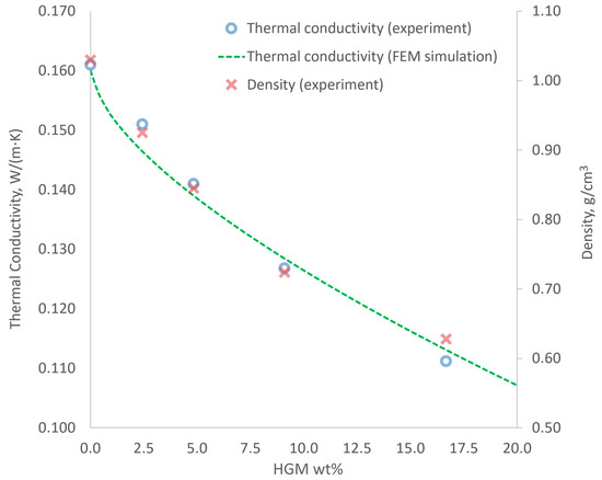 The dependence of TC and density of PDMS-HGMs composite on HGMs content, alongside with results of FEM simulation, are shown in Figure 4. It can be seen that both the TC and density are steadily decreasing with increasing HGM content, in a good agreement with FEM results. These facts suggest that significant amount of HGMs inside PDMS remained hollow; otherwise, we would observe increase in both TC and density caused by solid glass shatters that are heavier and better heat conduct than PDMS. In total, we achieved approx. 31% reduction in TC (from 0.161 to 0.111 W/(m⋅K)) at 17 wt% HGMs content. This result is far from the one obtained by Lee et al. [32] for specially treated aerogel filler. However, the use of HGMs benefits from simplicity of fabrication process as it does not require additional steps for preserving hollow structure and therefore can be performed outside of the laboratory conditions without the use of special equipment. In contrast, addition of silica aerogel without the pore restoration procedure results in increased TC of PDMS and other organic materials [25,32]. Therefore, the use of HGMs instead of silica aerogel particles can be justified in certain practical applications such as on-site preparation of sealer with enhanced thermal insulation. It should be noted that addition of HGMs above 17 wt% is problematic due to high viscosity of the solution making it difficult to pour.