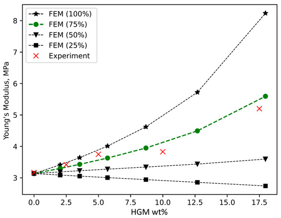 Next, the Young’s modulus of the samples was experimentally measured in compression test. It was found that at maximum HGM content (17%), the stiffness of the sample increased approximately 1.6 times. Results are presented as red crosses on the graph in Figure 5. Additionally, test conditions were simulated by FEM revealing that if we assume 100% of spheres survive mixing and compression test then expected stiffness of the samples filled with HGMs should significantly exceed the value found in experiment. From the TC and density data, we know that most of the spheres survive the mixing and polymerization procedure. Therefore, we suppose that some considerable number of spheres are broken during the compression test. Ideally, HGMs should greatly increase the stiffness of PDMS, since Young’s modulus of silicon glass is four orders of magnitude higher than that of a PDMS [40]. However, if spheres are broken and lose their structural integrity in already solidified sample, then they can be considered as spherical voids that have negative effect on elastic modulus. Therefore, FEM simulations can be used as a tool for estimation of the percentage of broken HGMs in the composite. Good agreement between measured and simulated results were found when the content of undamaged spheres in PDMS in FEM model was around 75% of all added spheres. Moreover, by extrapolating the magnitude of material damage, we also see that if only 25% of the spheres remain intact, then Young’s modulus of the composite will be even lower than that of a pure PDMS as it effectively turns PDMS into porous material.
