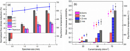 - The Joule temperature scale effect has a greater effect on the flow stress than the sample size effect for specimens of different dimensions. The sample with a diameter of 0.5 mm displayed abnormal flow behavior, which is related to surface oxidation leading to formation of a brittle surface layer.