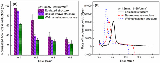- Due to the low β phase content and narrow interlamellar spacing of α lamellae grains, specimens with widmannstatten microstructure exhibit higher strength, smaller hardening rate and more easy flow localization compared with basket-weave microstructures.