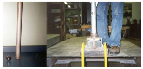 The first-crack impact resistance, ultimate impact resistance, first-crack impact toughness, and ultimate impact toughness of the mortar composites were determined according to the test method given by the ACI Committee 544 [49], using triplicate cylinder specimens (Ø150 mm × 62.5 mm). The test set-up consisted of a standard 4.5 kg compaction hammer with a 457 mm drop, conforming with the ASTM specification for the use of a compacting hammer in the laboratory [50], as well as a 63.5 mm (2.5 in) diameter steel ball, and a positioning fixture to hold the cylinder specimen. The principal components of the impact test apparatus are shown in Figure 5.