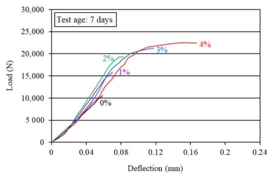 Characteristic flexural load-deflection behavior of the mortar composites at 7 days.