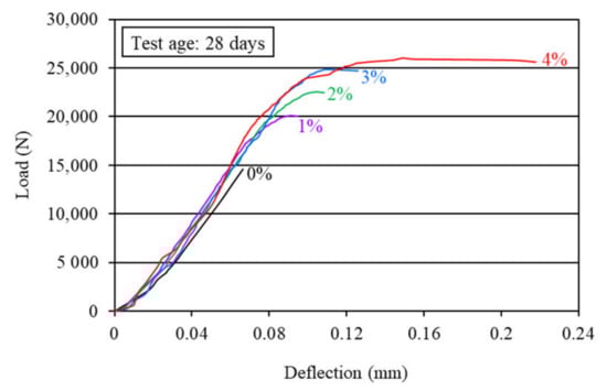 Characteristic flexural load-deflection behavior of the mortar composites at 28 days.