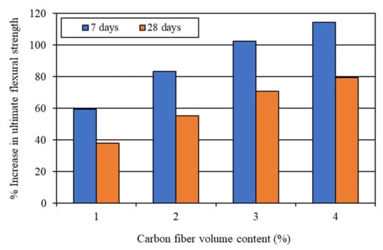 Increase in ultimate flexural strength due to the incorporation of carbon fibers.