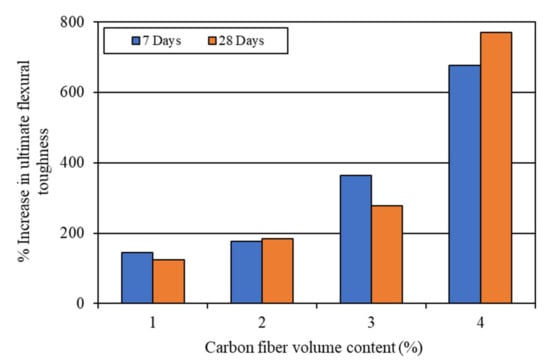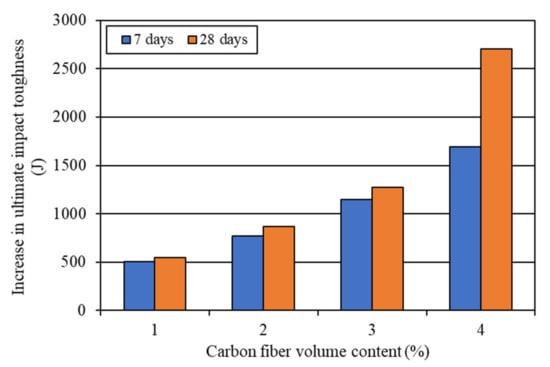 The increases in the impact toughness of mortar composites with different carbon fiber volume contents are shown in Figure 12 and Figure 13. The 7-day first-crack impact toughness increased by 403.5–907.8 J, while the 28-day first-crack toughness increased by 484.2–1109.6 J for 1–4% carbon fibers (refer to Figure 12). On the other hand, the 7-day ultimate impact toughness increased by 504.4–1694.7 J, whereas the 28-day ultimate toughness increased by 544.7–2703.3 J for 1–4% carbon fibers (refer to Figure 13). At the age of 28 days, the ultimate toughness increased by a large amount in the case of MCCF4, which included 4% carbon fibers, as can be seen in Figure 13. The excellent improvement in impact toughness is mostly credited to the greater anchorage and better interfacial bond of carbon fibers. The presence of silica fume enhanced the anchorage and bonding of the carbon fibers in mortar composite [2,31,53].